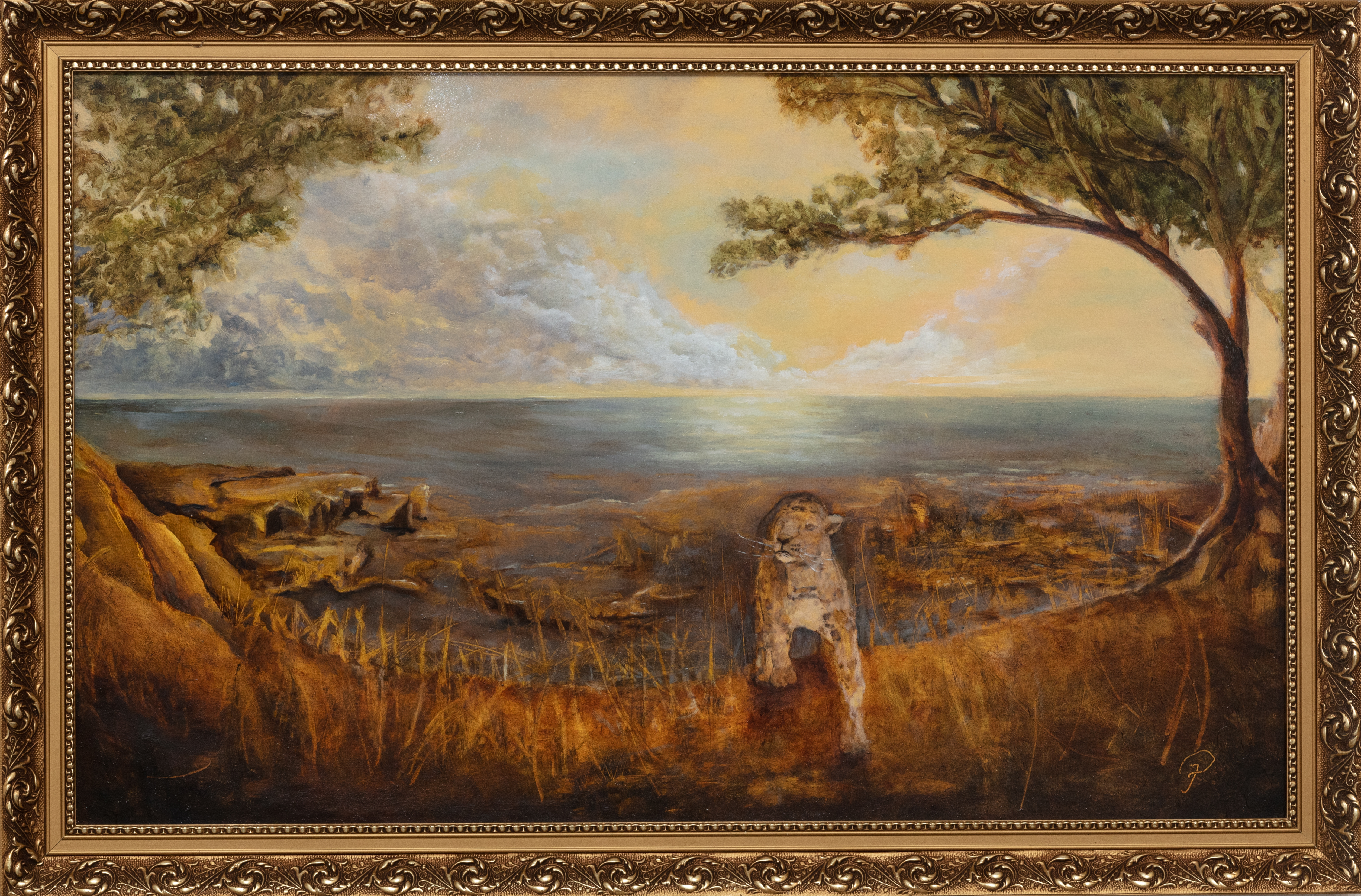 Ein anderes Kapitel zum Thema Komposition ist in den Landschaften am unteren Rand der Bilder zu sehen. Beispiel Einladungsbild: Hier ist es zuerst die Ausgewogenheit zwischen den beiden äußeren Ecken, sichtbar durch die symmetrische Platzierung zweier Bäume. Zugleich dienen diese, wie das Bild der Einladung andeutet, der Verlagerung oder Aufhebung der Symmetrie, unterstützt von der leicht diagonal angelegten Perspektive, unterstrichen von dem neben die Mittelachse gesetzten Tiger und der Reflexion am Horizont. So entstehen Spannungen in den Bildern und Spannungen sind Elemente der Schönheit. In anderen Bildern sind es einsame Baumreste, die den Blick auf sich ziehen und entsprechende Empfindungen der Verlorenheit stimulieren.
