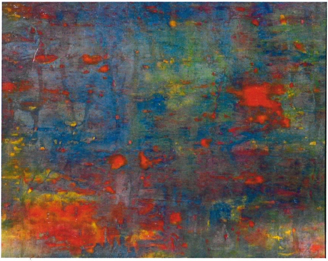 Dieser Gruppe hängt ein Bild gegenüber, das ganz anders ist und zu den ausgearbeitesten der Ausstellung gerechnet werden muss: Es hat aber einen ähnlichen Titel: Statt “Mal so, mal so” lautet er: “Alles ist auch anders möglich”. Auch hier müssen wir erst das Bild auf uns wirken lassen: Dabei stellen wir fest, dass die Bildfläche sich auflöst in zahlreiche Einzelformen, die kräftig genug sind, sich gegen das Versinken und Auflösen in einen formfreien Tiefenbereich zur Wehr zu setzen. Stattdessen sehen wir auf konturierten Stücken herausgearbeitete Formen, die auch die Struktur des Materials, das als Bildfläche dient, sichtbar macht. Der Künstler hatte unterschiedliche Materialien wie Krepp-Papier, Glasscherben oder Pflanzenblätter auf die Bildfläche gelegt, Farben darauf gegeben und diese in den Bildgrund eindringen lassen. Danach das Fremd-Material wieder entfernt und auf diese Weise die Mischungen erzielt, die wir jetzt sehen. Was sich in diesem Bild ergeben hat, wie die konturierten kleinen Inseln Formen, erinnert mich an Teilstücke altchinesischer Landschaften mit vielen Bergpassagen. So ausgeprägt tauchen ähnliche Motive in keinem anderen Bild wieder auf.