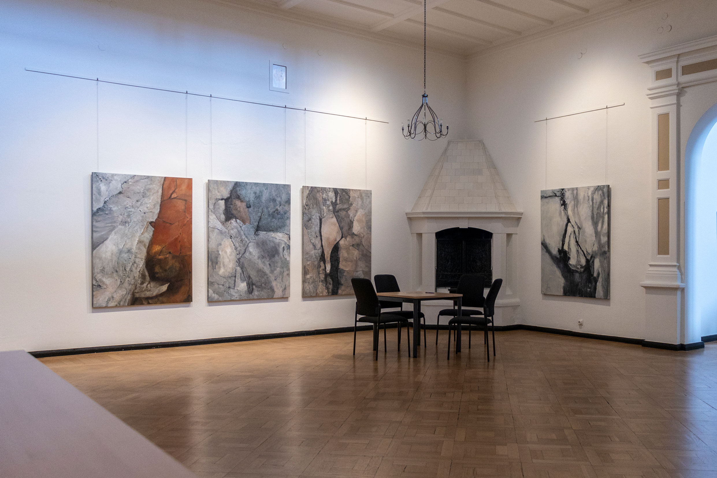 Erst allmählich entwickelt sich beim Betrachten eines Bildes ein Raum-Empfinden: Ist das Gestein im Bild stark vergrößert oder verkleinert oder real? Und das Auge sucht nach Anhaltspunkten, die Aufschluss geben können. Es entdeckt in verschiedenen Kompositionen mal eine gemauerte Form, ein Gerüst wie ein Regal, eine Stuhllehne oder eine nach vorn gekippte Lore, mit der einmal Steine transportiert wurden. Diese Entdeckungen unaufdringlicher Gegenstände können den ersten Bildeindruck stark verändern, weil sie die Proportionen neu bestimmen.