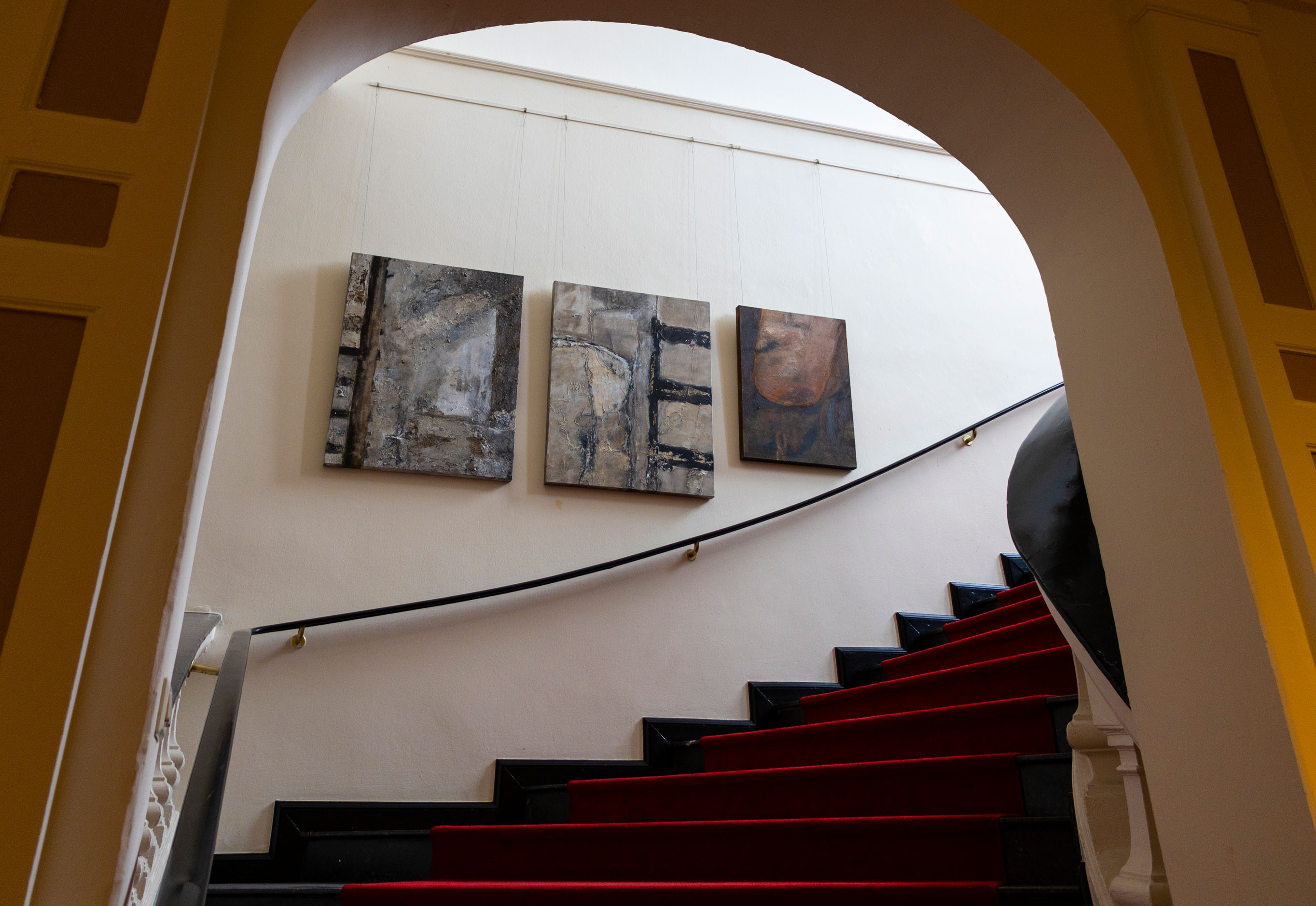 Während der Schulzeit und des Studiums erweiterte sich ihr Blick auf Steine durch ihre Auseinandersetzung mit Literatur und Geschichte. Ihr besonderes Interesse galt und gilt den steinigen Zeugen vergangener Zeiten. Rilke und seine Verwendung des Steinmotivs in Gedichten und Texten faszinieren sie bis heute. Im Laufe der Jahre als freie Künstlerin hat sie sich diesem Thema verstärkt gewidmet – jetzt getragen vom malerischen Prozess. Petra Knauer malt keine Steine ab, sie braucht keine Foto-Vorlagen – die Imagination, die Kraft der inneren Bilder formt, was auf der Leinwand entsteht und damit auch den Stein, der gerade abgebildet wird. Er wächst langsam, manchmal, indem Farben übereinander gezogen werden, manchmal, indem die Oberfläche des Stein-Motivs die bröckelige Form eines zerfallenden Steins erhält. Die Oberfläche wird pastos und zugleich wird die Farbigkeit um etliche Töne reicher, weil nun zum Licht, das gemalt wird, von außen reales Licht auf der Bildfläche die Bröckchen erleuchtet oder verschattet.